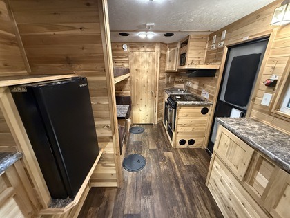 Added a better futon and new bunk bed. Kitchen cabinets and a wood stove.